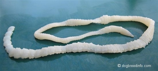 Apparently, fleas think that tapeworm eggs are very tasty. Tapeworms are then transmitted to dogs and cats that ingest fleas. When you think of a cat grooming herself or a dog chewing away at an itch on his skin, you can understand how easy it is to ingest them. Another method of transmission is eating wildlife or rodents that have either tapeworms or fleas. Tapeworms can reach 4 to 6 inches (10 to 15 cm) in length within the pet’s intestine. Each worm may have as many as ninety segments, with the head at one end and many tiny brick-like repeating segments following. The segments farthest from the head detach. They come out in the stool and can be seen as little rice-sized pieces attached to the fur around