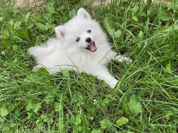 The message was clear — Romeo wanted a form like his former self but with a white coat. A Samoyed, which can weigh 65 pounds, is more than we can handle, so we found a wonderful breeder of American Eskimo dogs (think smaller Samoyeds), and that’s how Romeo came back to us!
