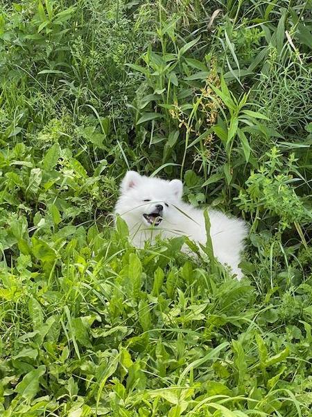 and could spend hours sleeping outside on the grass or even directly on snow. Lucas is the same way — he’ll roll around on the grass, nibble at every interesting plant, and just smile the exact same that Romeo smiled.